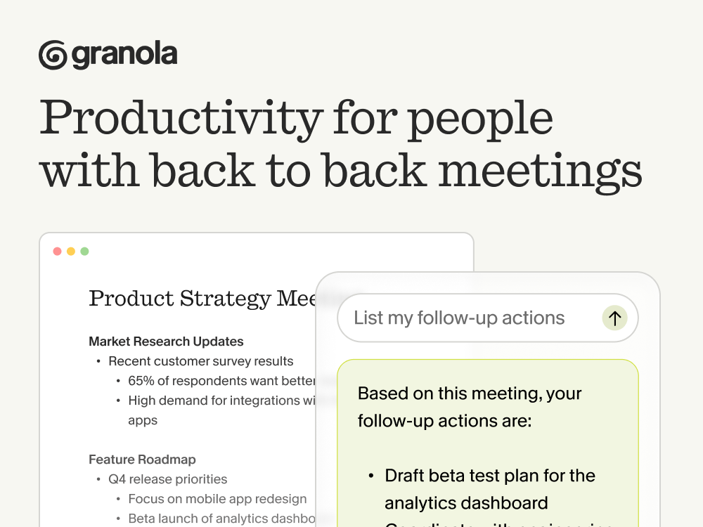With Granola, the AI Notepad for people with back-to-back meetings, you can avoid context switching, the cognitive load of remembering what you promised … and the stress of knowing something important slipped through.